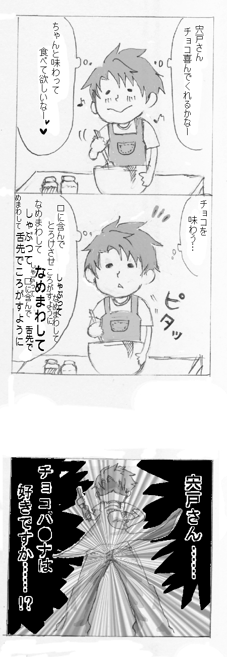 バレンタイン☆チッス漫画を思うがままに描き殴ってしまったのですが、どーもアイタタな結果になってしまいました。特に私の性格を知ってる人ならお見通しでしょうが、私、かなりの下ネタスキー症候群にかかってるぽなので、そういう系がダメダメダーメな方は見ちゃダメダメダーメですよん☆
