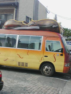 分かりますかねー??なんか茶目っ気をかもし出すバスにでっかいバイオリンみたいなのがブッ刺さってるのが。一瞬サーカスの移動バスかと思ってワクワクしちゃいましたよー。サーカスワクワク。サーカスワクワク。